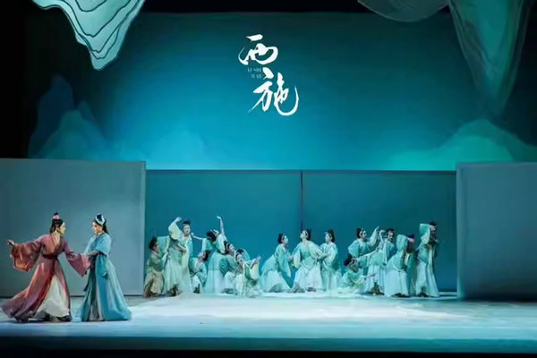 李白《浣纱石上女》写到:“玉面耶溪女,青娥红粉妆。一双金齿屐,两足白如霜。”西施善舞,春秋时期著名的宫廷舞蹈,同时也是被后世人誉为中国最早的“踢踏舞”——“响屐舞“——即为西施首创。舞者脚穿木屐、裙系小铃,面容之美与木屐之美相映成辉。舞剧《西施》中,舞者们向观众重现了这一失传千年的曼妙舞姿。裙摆摇曳,铃铛作响,一副春秋画卷在观众面前缓缓展开。不仅展现出西施的聪明才智和艺术天赋,更展示了中国古代舞蹈的辉煌成就。