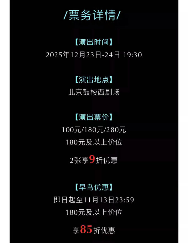 因剧情需要,迟到观众演出开始15分钟后方可入场;演出票当日有效,逾期不作退换;由于地理位置的原因,鼓楼西剧场无法提供车位,请大家绿色出行;为了不影响胡同交通,营造更好的观演环境,请骑共享单车的观众朋友,妥当停置单车(小八道湾胡同与鼓楼西大街交叉口指定停放处),非常感谢您的理解与配合!