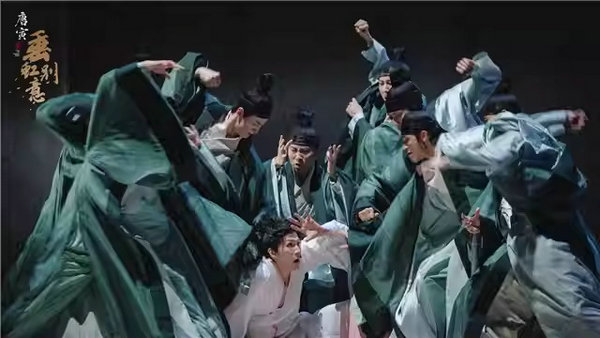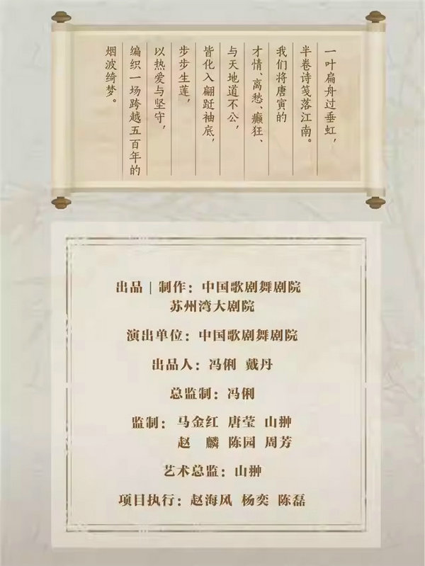 舞剧《垂虹别意·唐寅》由中国歌剧舞剧院与苏州湾大剧院联合打造,是国家艺术基金2025年度大型舞台剧和作品创作资助剧目。该剧以明代“江南第一才子”唐寅传奇的一生为叙事线索,以“垂虹桥”这一蕴含江南文化的地理坐标为意象,将其画作《垂虹别意图》中“送别”的意境与个人际遇的流转及心境的变迁相融合,深刻地展现了唐寅如何在接踵而至的命运重击下,依旧怀揣着赤子之心,以笔墨寄情,追寻美好,在苦难中淬炼出艺术的风采,在逆境中绽放出生命的灼灼光华。