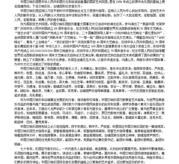 As a pioneer, promoter and leader in the development of Chinas symphonic music and choral career, CNSO unremittingly strive for artistic excellence and makes outstanding contributions to the dissemination and promotion of the worlds classical music works. In 1959, CNSO performed Beethovens Symphony No. 9 for the first time in China and introduced many timeless works by master composers including Bach, Mozart, Brahms, Johann Strauss, Tchaikovsky and Shostakovich to the Chinese audience. Furthermore, the orchestra is dedicated to fostering creativity and originality of Chinese music. In 1970, CNSO composed and premiered the piano concerto "Yellow River". In recent years, CNSO has presented widely acclaimed concerts including "Charm of the Chinese Music" "Charm of the Classics" "Opera Concert" and "Talents of CNSO", all of which have garnered widespread praise from audiences both at home and abroad.