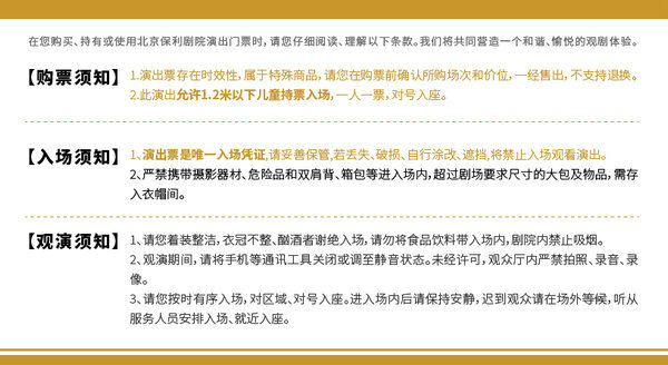 【入场须知】演出票是唯一入场凭证,请妥善保管,若丢失、破损或自行涂改、遮挡,将禁止入场观看演出。