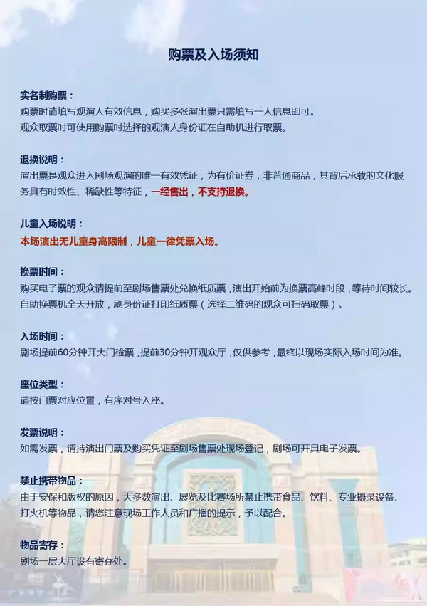 2、演出票品非普通商品,具有时效性、稀缺性等特征,售出后不支持退换。请您务必认真核对购票信息并妥善保管票券或电子订单,如因个人原因无法观看,请您自行妥善处理票品,给您造成不便敬请谅解。