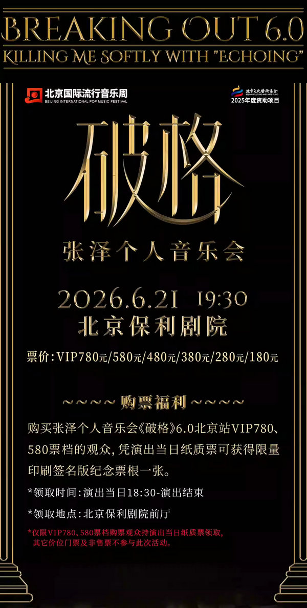 购买张泽个人音乐会《破格6.0》北京站VIP780元及580元票档的观众,演出当日18:30至演出结束后凭演出纸质票至保利剧院大堂可获得限量印刷签名版纪念票一张(仅限VIP780元及580元票档购票观众持当日演出纸质票领取,其他价位门票及非售票观众不享受此福利)