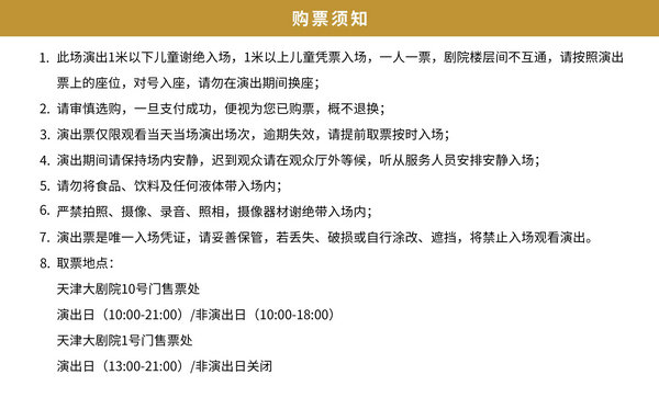 5.票品为有价证券,非普通商品,其背后承载的文化服务具有时效性、稀缺性等特征,不支持退换。如您购票后无法正常观看,还请自行处理。