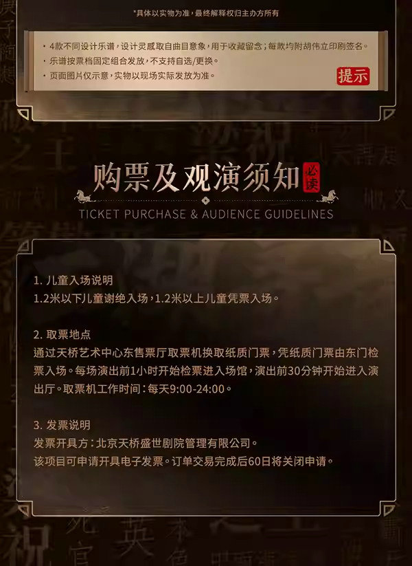 5.票品为有价证券,非普通商品,其背后承载的文化服务具有时效性、稀缺性等特征,不支持退换。如您购票后无法正常观看,还请自行处理。