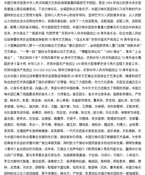 As a pioneer, promoter and leader in the development of Chinas symphonic music and choral career, CNSO unremittingly strive for artistic excellence and makes outstanding contributions to the dissemination and promotion of the worlds classical music works. In 1959, CNSO performed Beethovens Symphony No. 9 for the first time in China and introduced many timeless works by master composers including Bach, Mozart, Brahms, Johann Strauss, Tchaikovsky and Shostakovich to the Chinese audience. Furthermore, the orchestra is dedicated to fostering creativity and originality of Chinese music. In 1970, CNSO composed and premiered the piano concerto "Yellow River". In recent years, CNSO has presented widely acclaimed concerts including "Charm of the Chinese Music" "Charm of the Classics" "Opera Concert" and "Talents of CNSO", all of which have garnered widespread praise from audiences both at home and abroad.