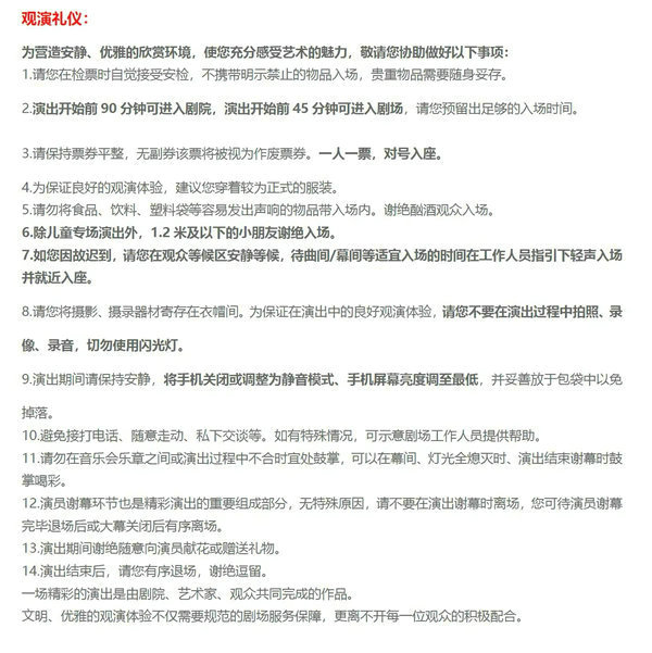 2.凡演出票类商品,开票时间一般为演出前二到四周,正式开票后如有特殊情况客服会第一时间电话联系您,请保持电话畅通。