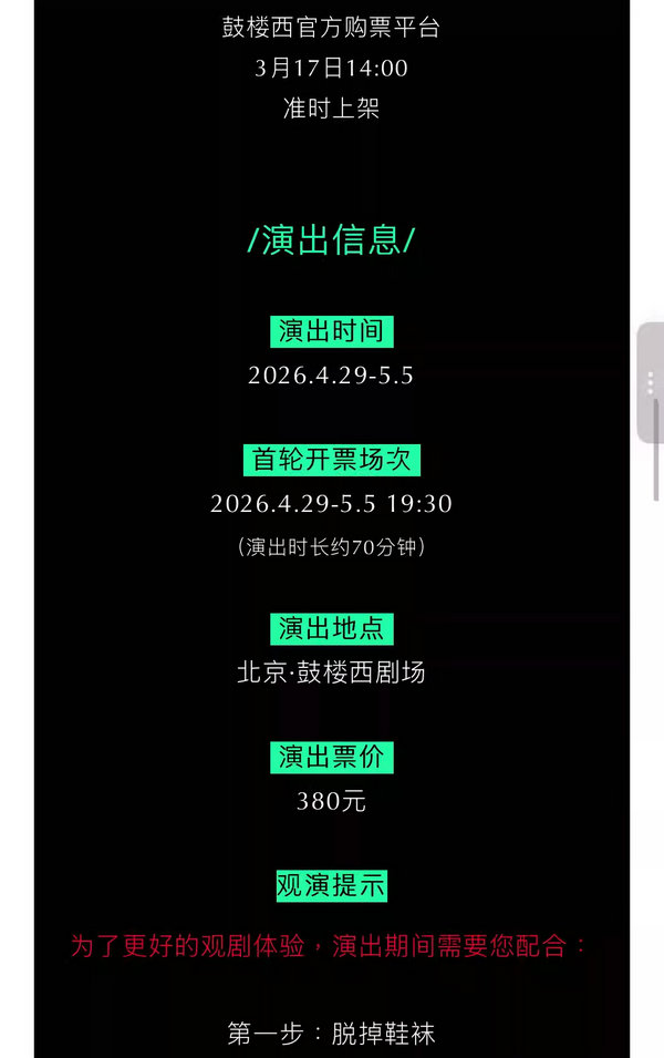 因剧情需要,迟到观众无法入场;演出票当日有效,逾期不作退换;由于地理位置的原因,鼓楼西剧场无法提供车位,请大家绿色出行;为了不影响胡同交通,营造更好的观演环境,请骑共享单车的观众朋友,妥当停置单车(小八道湾胡同与鼓楼西大街交叉口指定停放处),非常感谢您的理解与配合!
