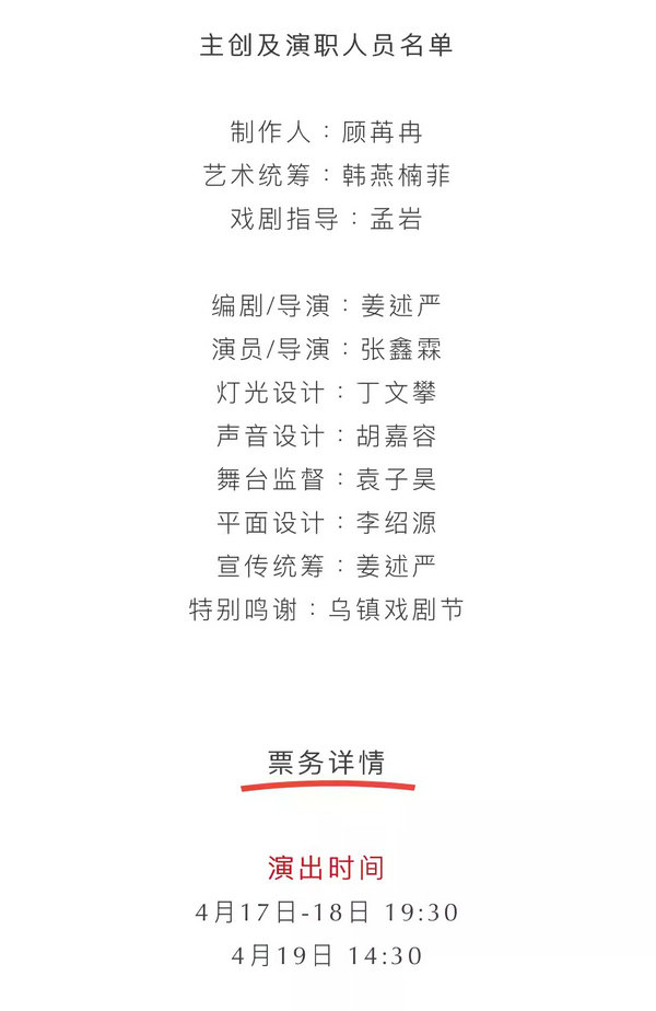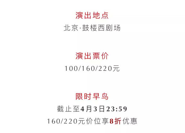 温馨提示 票品为有价证券,非普通商品,其背后承载的文化服务具有时效性,稀缺性等特征,不支持退换。 特别提醒: 因剧情需要,迟到观众演出开始15分钟后方可入场;演出票当日有效,逾期不作退换;由于地理位置的原因,鼓楼西剧场无法提供车位,请大家绿色出行;为了不影响胡同交通,营造更好的观演环境,请骑共享单车的观众朋友,妥当停置单车(小八道湾胡同与鼓楼西大街交叉口指定停放处),非常感谢您的理解与配合!