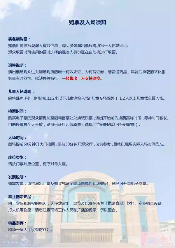 2、演出票品非普通商品,具有时效性、稀缺性等特征,售出后不支持退换。请您务必认真核对购票信息并妥善保管票券或电子订单,如因个人原因无法观看,请您自行妥善处理票品,给您造成不便敬请谅解。